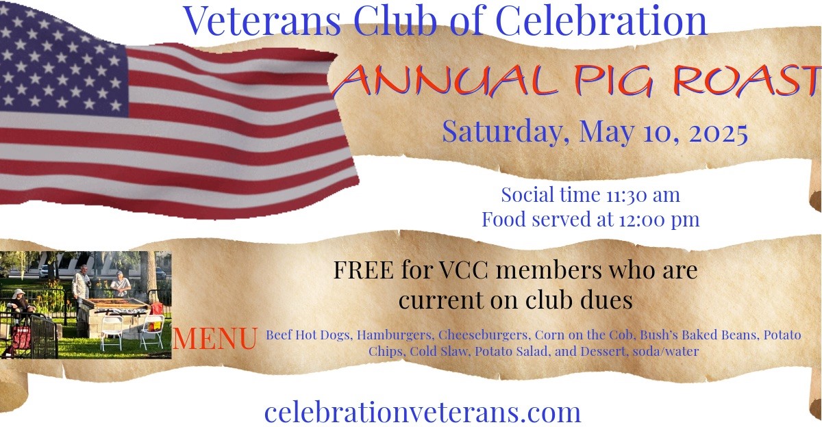 Join our Annual Pig Roast on May 10 at 12:00 PM at the Celebration Lakeside Pavilion! All current Veterans Club of Celebration members are cordially invited! If you haven’t paid your dues for the year ($12) please feel free to pay them at the pig roast or on our website – click here!