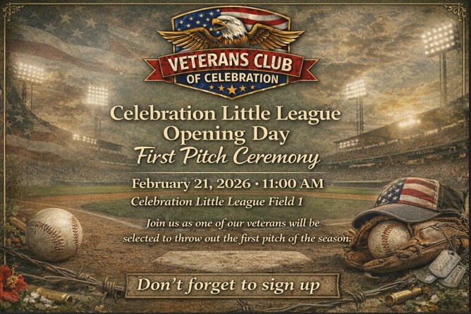 Join us throwing out the first pitch! Click here to register for this event. The Celebration Little League is proudly continuing its cherished tradition of honoring our nation’s heroes by inviting the Veterans Club of Celebration to their opening day ceremonies on Saturday, February 22, at 11:00 a.m. located by the Celebration K-8 ball field. This […]