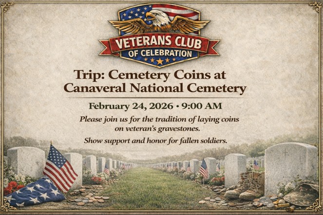 Please join us on Tuesday, February 24, 2026 at 9 AM at the Celebration Town Hall building (851 Celebration Ave, Celebration – see map below) for a trip to the Canaveral National Cemetery (click here for the cemetery location) for the traditional of laying coins on veteran’s gravestones. Placing a coin on headstones of a […]