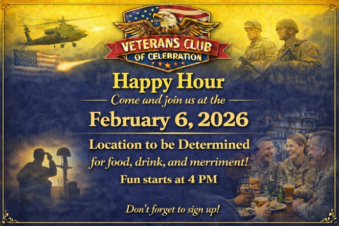 Join us at our February 12, 2026 membership meeting at Windsor in the Celebration Center (see the location on the map below). All Veterans Club of Celebration members and new members are welcome. Free pizza social begins at 6:00 PM with the meeting starting at 6:30 PM. We hope to see you there!