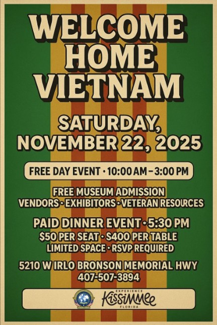 Join us for a heartfelt “Welcome Home Vietnam” event on Saturday, November 22, 2025, at 5210 W Irlo Bronson Memorial Hwy, Kissimmee, Florida. The free day event from 10:00 AM to 3:00 PM offers museum admission, vendors, exhibitors, and veteran resources. Follow it with a paid dinner event at 5:30 PM, priced at $50 per seat or $400 per table, with limited space—RSVP required. Contact 407-507-3894 for more details.